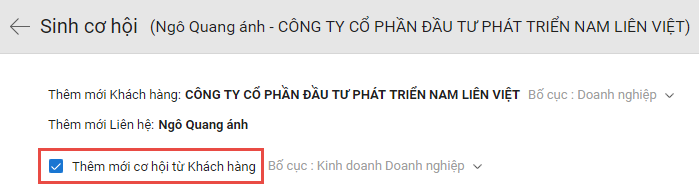 - Nếu không Sinh cơ hội mà chỉ tạo Khách hàng, Liên hệ chăm sóc tiếp thì bỏ tích Thêm mới cơ hội từ Khách hàng.